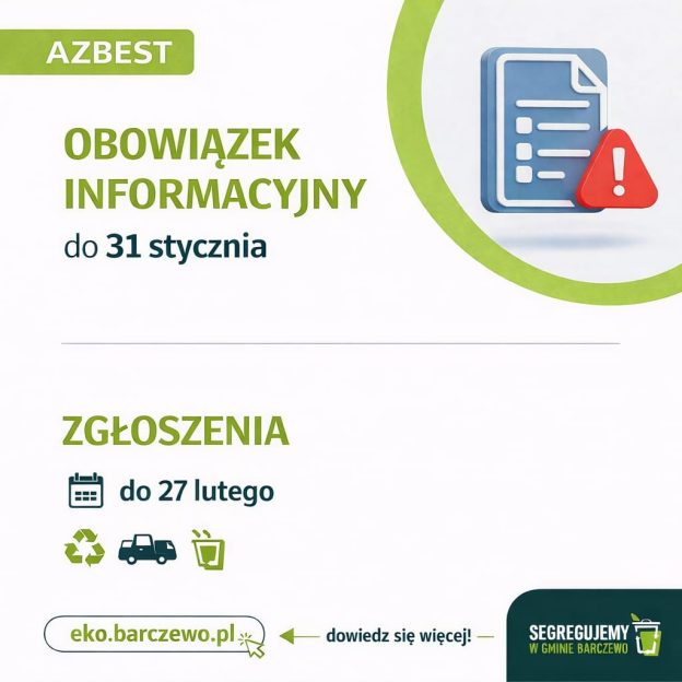 Mieszkańcy zainteresowani ubieganiem się w 2026 roku o dofinansowanie na demontaż, transport i utylizację wyrobów zawierających azbest powinni zgłosić taką potrzebę do 27 lutego 2026 r. w formie pisemnej w Urzędzie Miejskim w Barczewie.