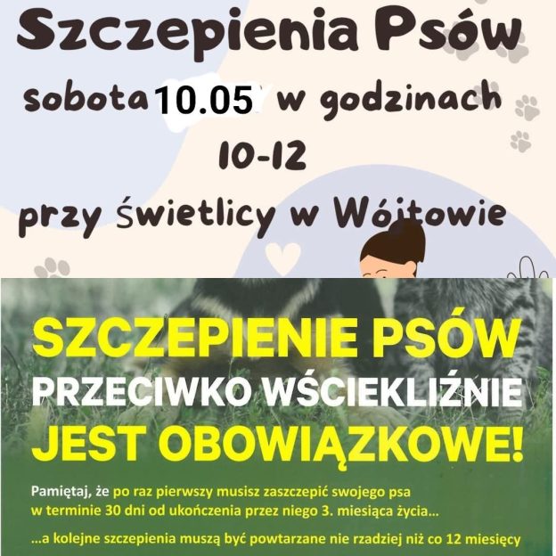 Coroczne szczepienie psów i kotów przeciwko wściekliźnie odbędzie się 10 maja 2025 r. (sobota) w godzinach od 10.00 do 12.00, przy świetlicy ul. Wierzbowa 1, koszt 50 zł.